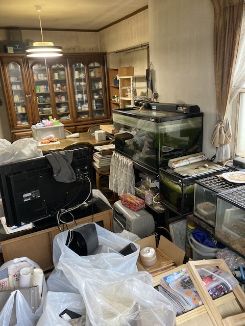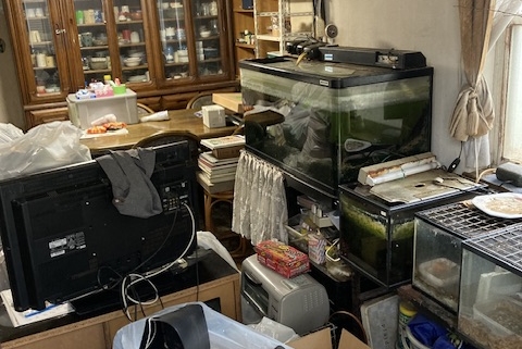 リビングで最も大変だったのは、複数設置されていた大型の水槽でした。
