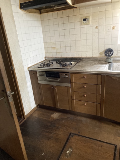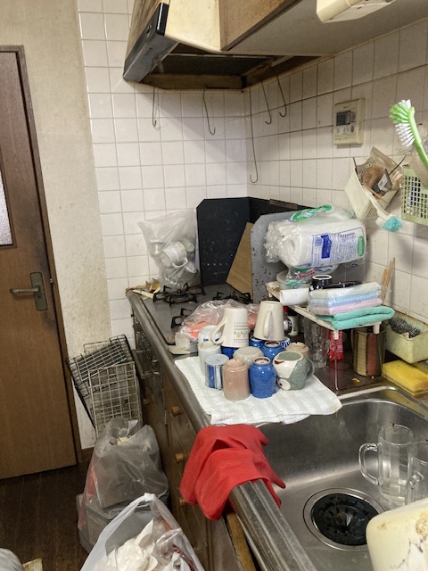 キッチンにも、多くの荷物や日用品が残されている状態でした。