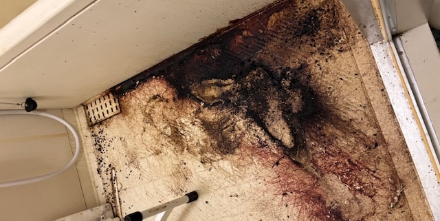 エプロンを外して内部を確認すると、やはり浴槽下部まで体液が広がっている状態でした。この部分を取り除かないかぎり、臭気の完全な除去は不可能です。