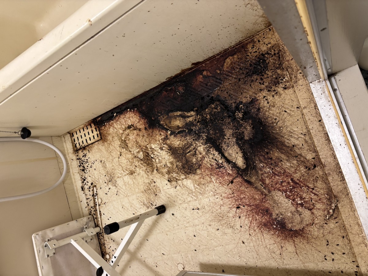 エプロンを外して内部を確認すると、やはり浴槽下部まで体液が広がっている状態でした。この部分を取り除かないかぎり、臭気の完全な除去は不可能です。