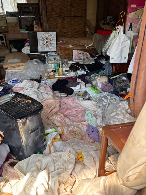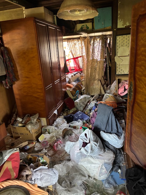 こちらの和室には膝の高さほどまでゴミが堆積しており、特に衣類類については強い臭気が確認されたため、再利用は難しいと判断し、すべて処分対応といたしました。