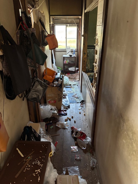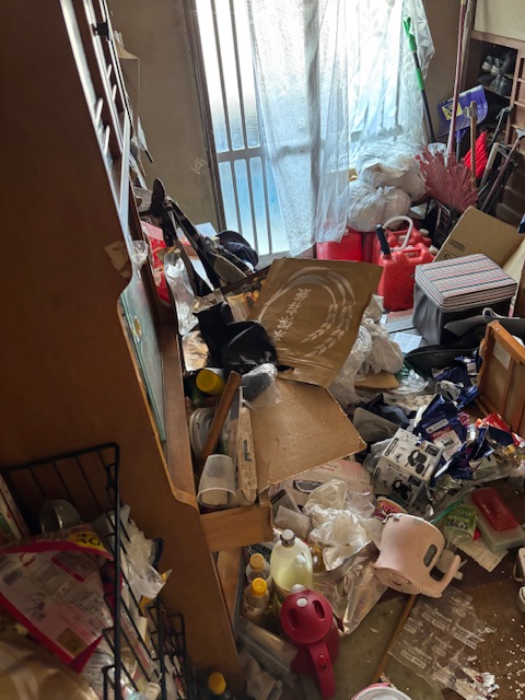 玄関まわりは足の踏み場もない状態だったため、作業開始時は別の窓から室内へ入室し、片付けを進めました。