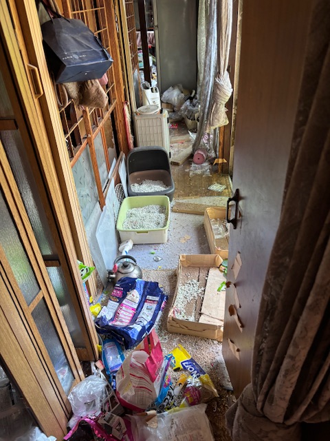 また、室内で猫を飼育されていた形跡があり、長期間にわたって蓄積した強い臭気に加え、糞尿による汚れが各所に見受けられる状況でした。