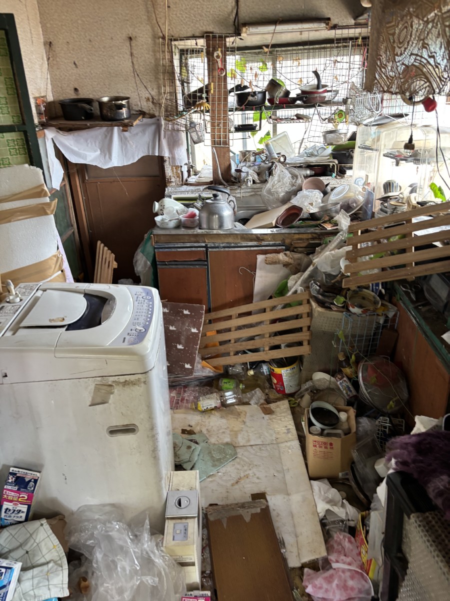 キッチンスペースには洗濯機が設置されたままの状態で、調理器具に加え、賞味期限が大きく過ぎた食料品が大量に残されていました。