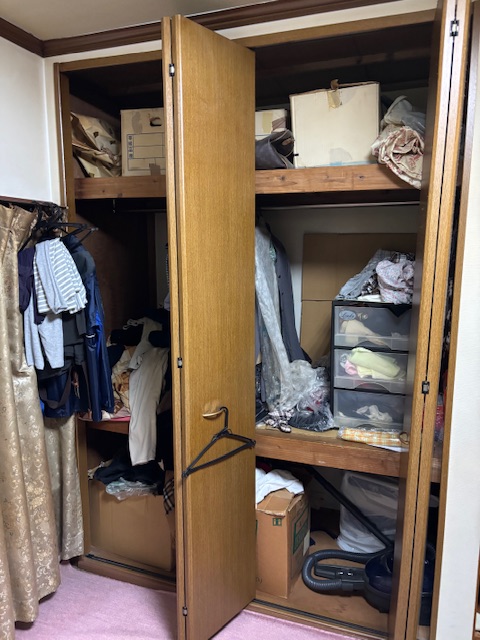 収納スペースであるクローゼット内には、洋服がきちんと収められていました。こちらについても一つひとつ丁寧に仕分けを行い、内容を確認しながら作業を進めています。