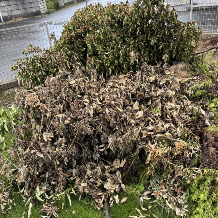 | 作業内容 | 敷地内に植えられていた樹木・植栽の伐採作業を実施。成長により管理が難しくなっていた庭木を対象に、周囲の構造物や隣地へ影響が出ないよう、切り分けながら安全に撤去しました。伐採後は簡易的な清掃まで対応しています。 |