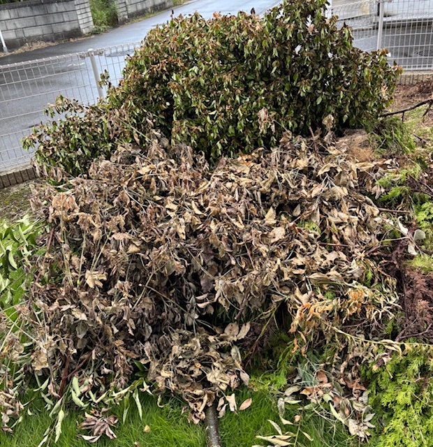 撤去した草木や枯れ草の量は多く、全体で2トン車1台分に相当する量となりました。敷地内に残さず回収し、次の利用や引き渡しに支障が出ない状態まで整理しています。