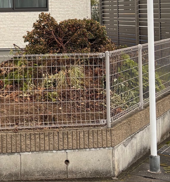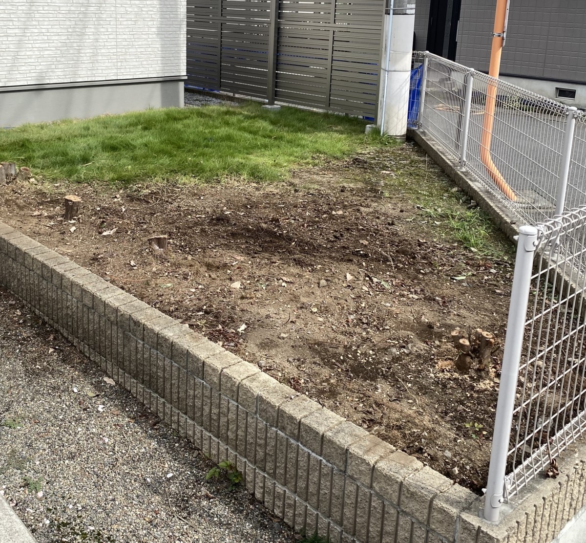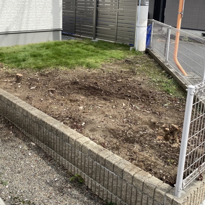 | 間取 | 庭スペース。限られた作業動線の中で、足場や周囲の植栽・外構を傷めないよう、手作業中心で対応。 |