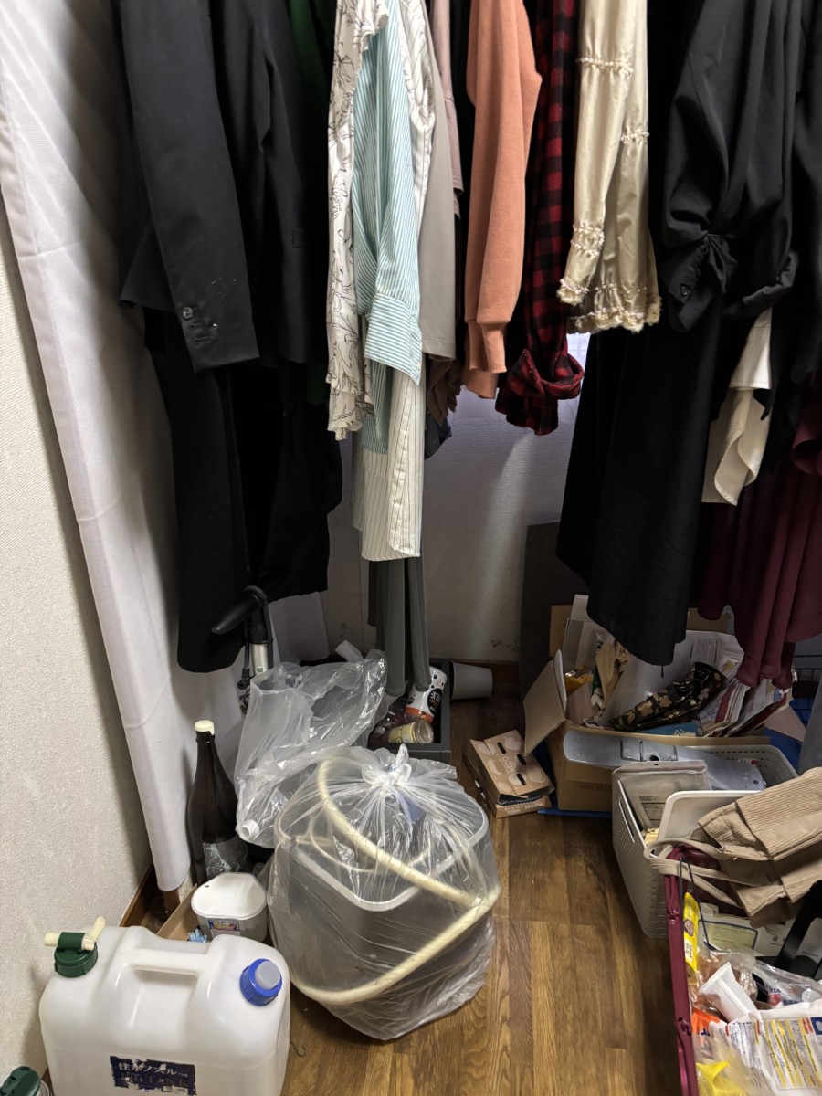 こちらの部屋にはたくさんの衣類がありましたが、衣類は東南アジアに出荷させていただきました。また、こちらのケアに収納スペースがたくさんあり、そちらからも衣類がたくさん出てきましたので、同様に処理しております。